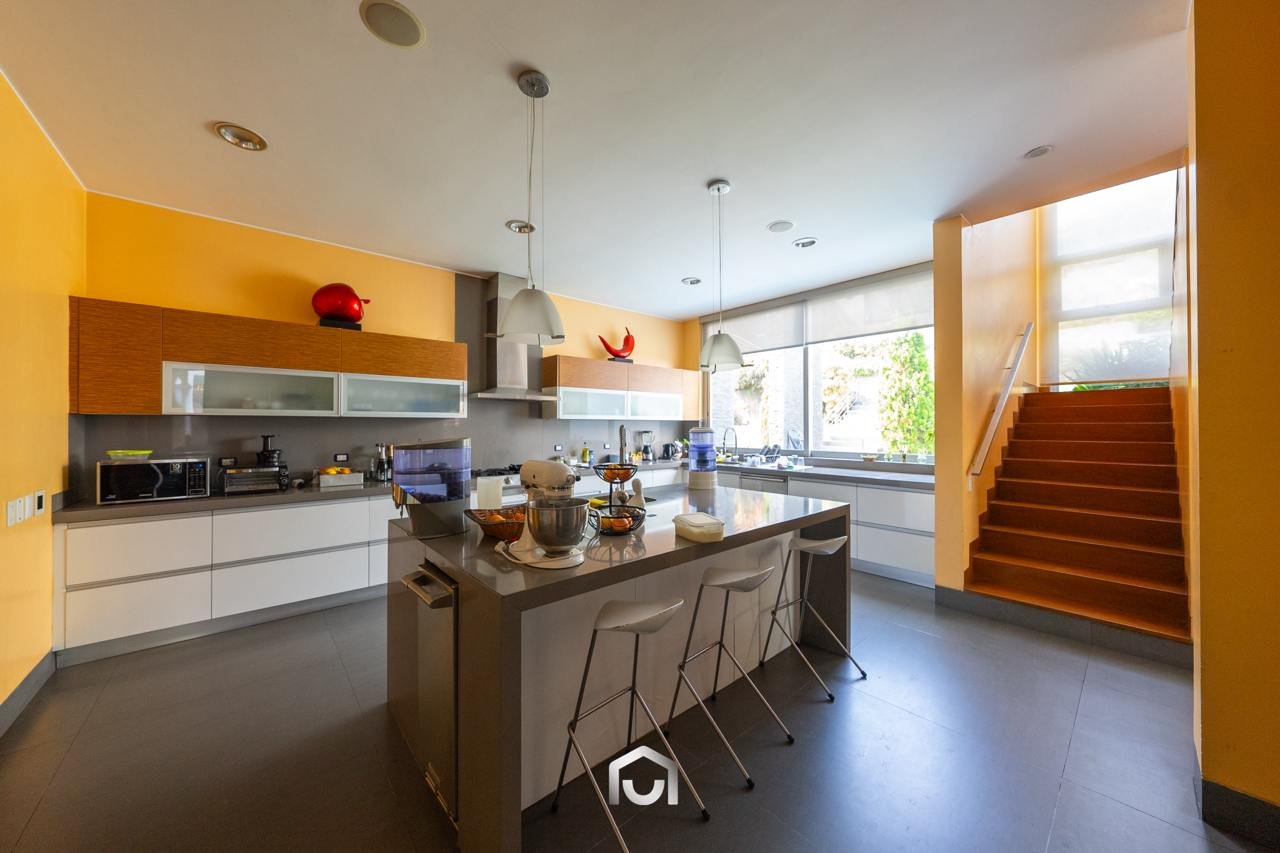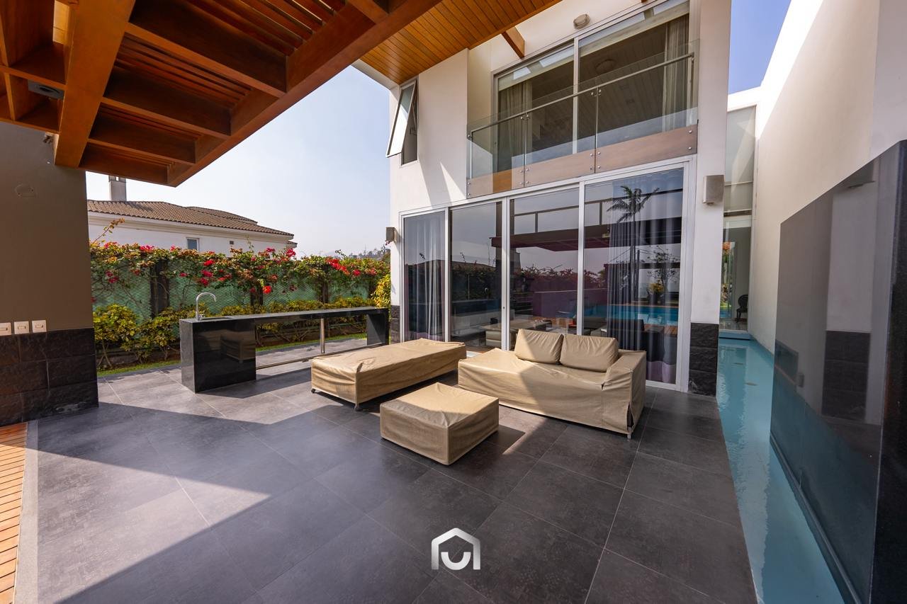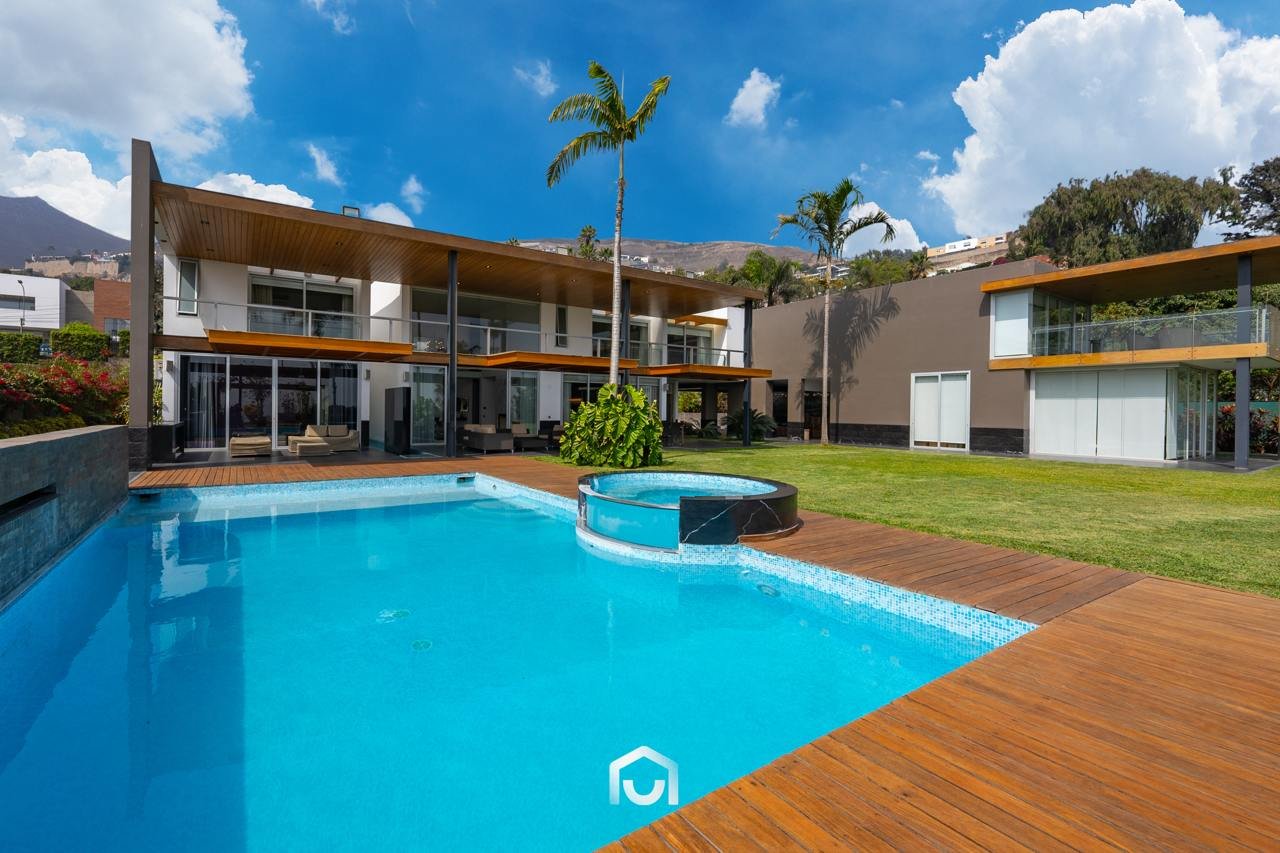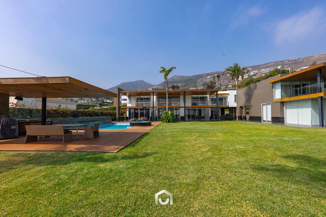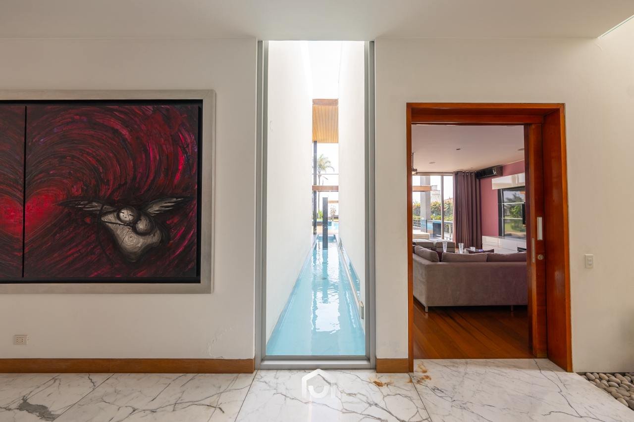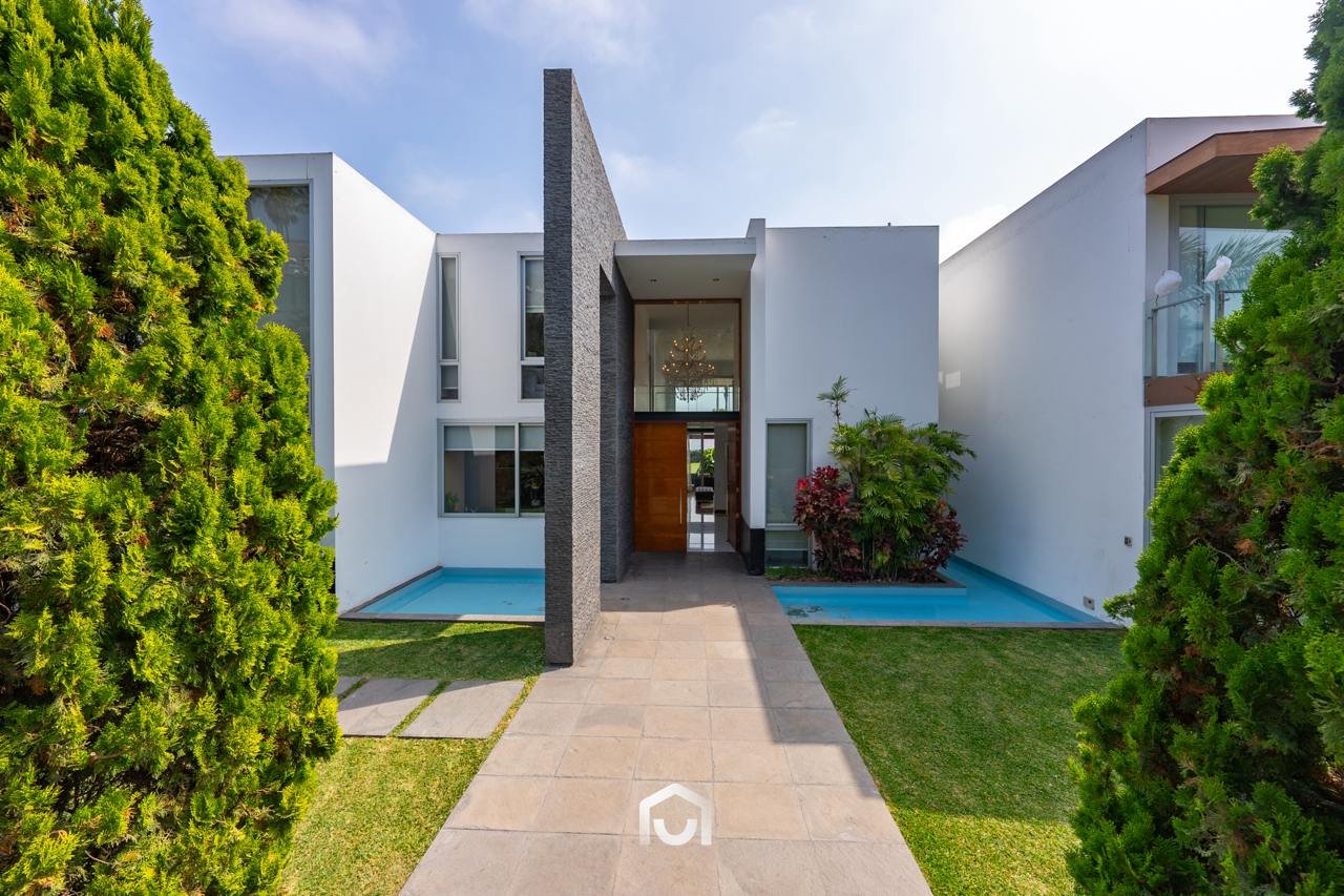 La casa ha sido construida completamente en un terreno nivelado, a pesar de que originalmente era inclinado. Presenta una fachada imponente con una puerta de gran tamaño. En el interior destacan los pisos claros y diversos elementos arquitectónicos diseñados por el arquitecto Mallachowski, como ductos de iluminación cenital que permiten una conexión visual constante con el jardín, la piscina y el cielo. La sala de doble altura se abre hacia una terraza con techos de madera, creando un ambiente cálido. La propiedad cuenta con acabados de alta calidad, una cava de vinos en el sótano ya equipada, y un jardín amplio. Además, incluye una piscina de buen tamaño y un ambiente adicional en el sótano con vista subacuática, ideal para gimnasio o sala de entretenimiento. En el segundo piso se ubican seis dormitorios con baño incorporado, siendo el principal una suite con ingreso privado, walk-in closet, baño con jacuzzi, espacio para masajeador y vistas al exterior gracias a ventanales en esquina.