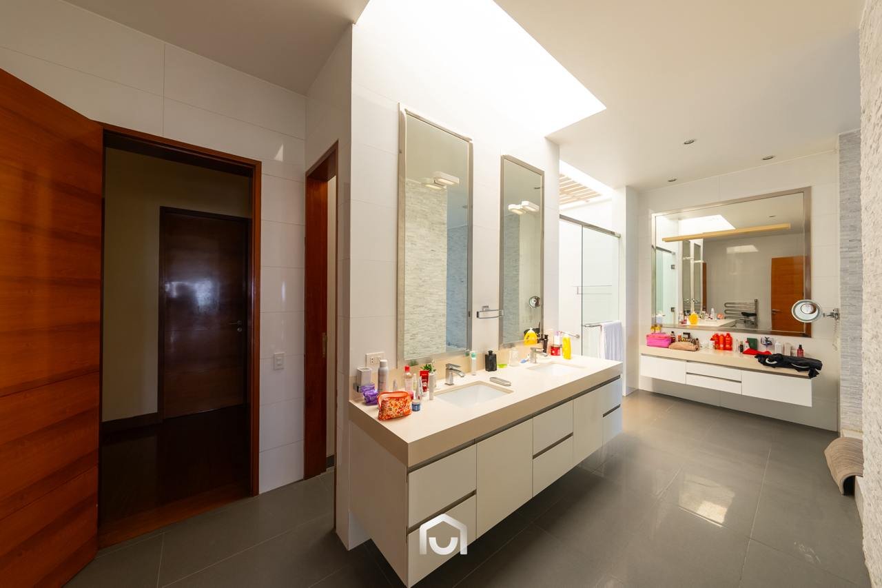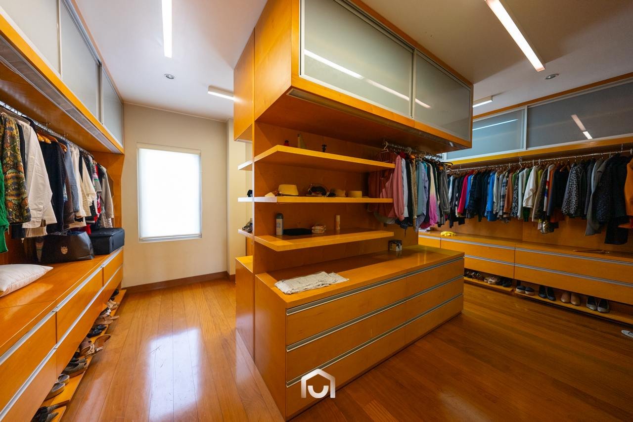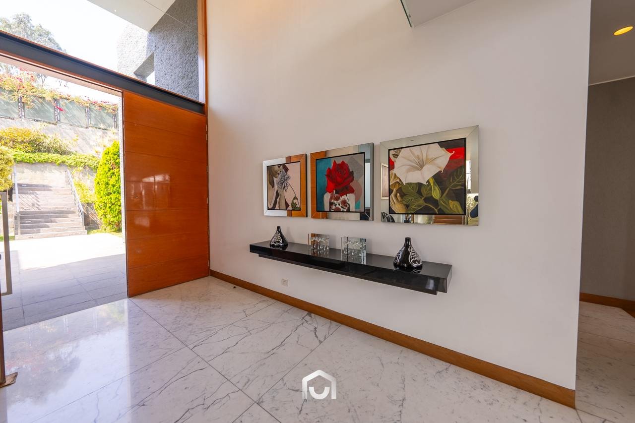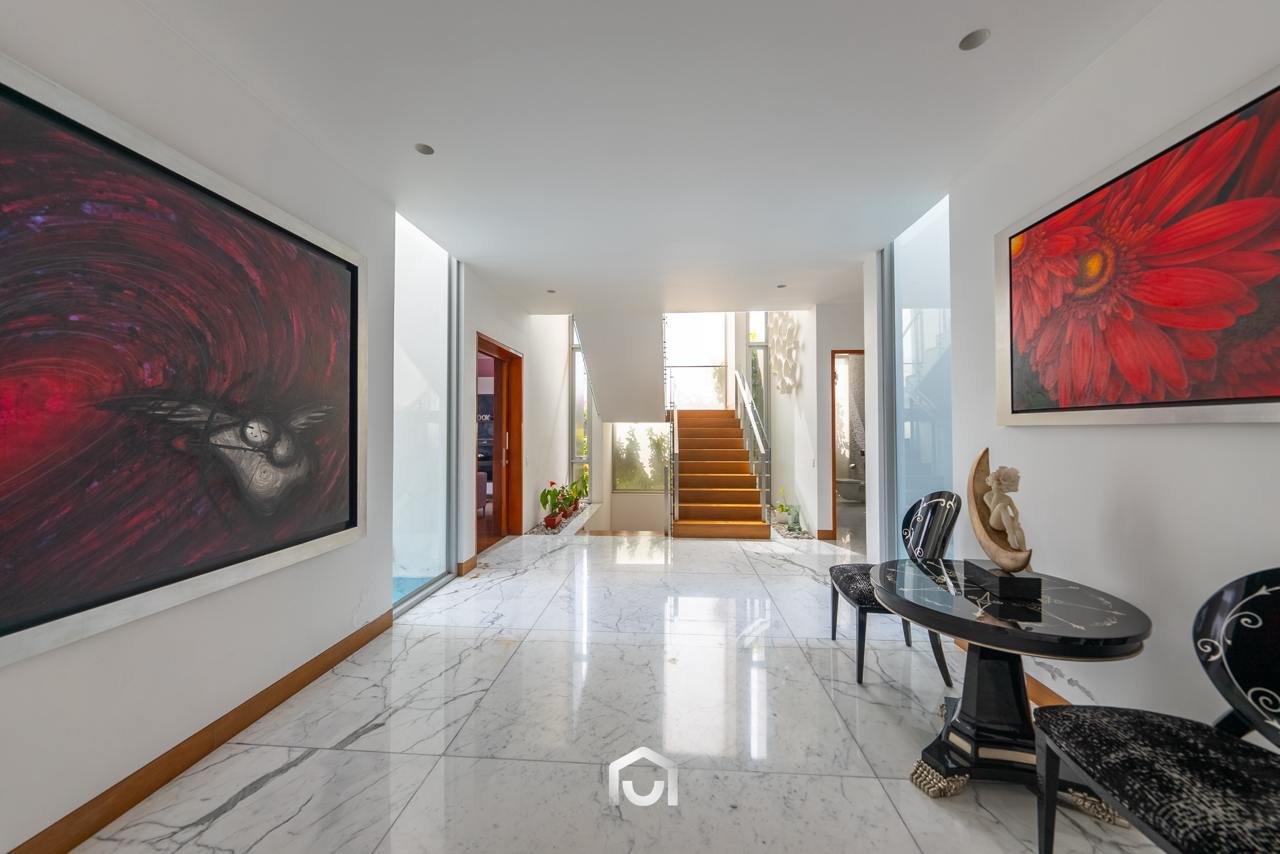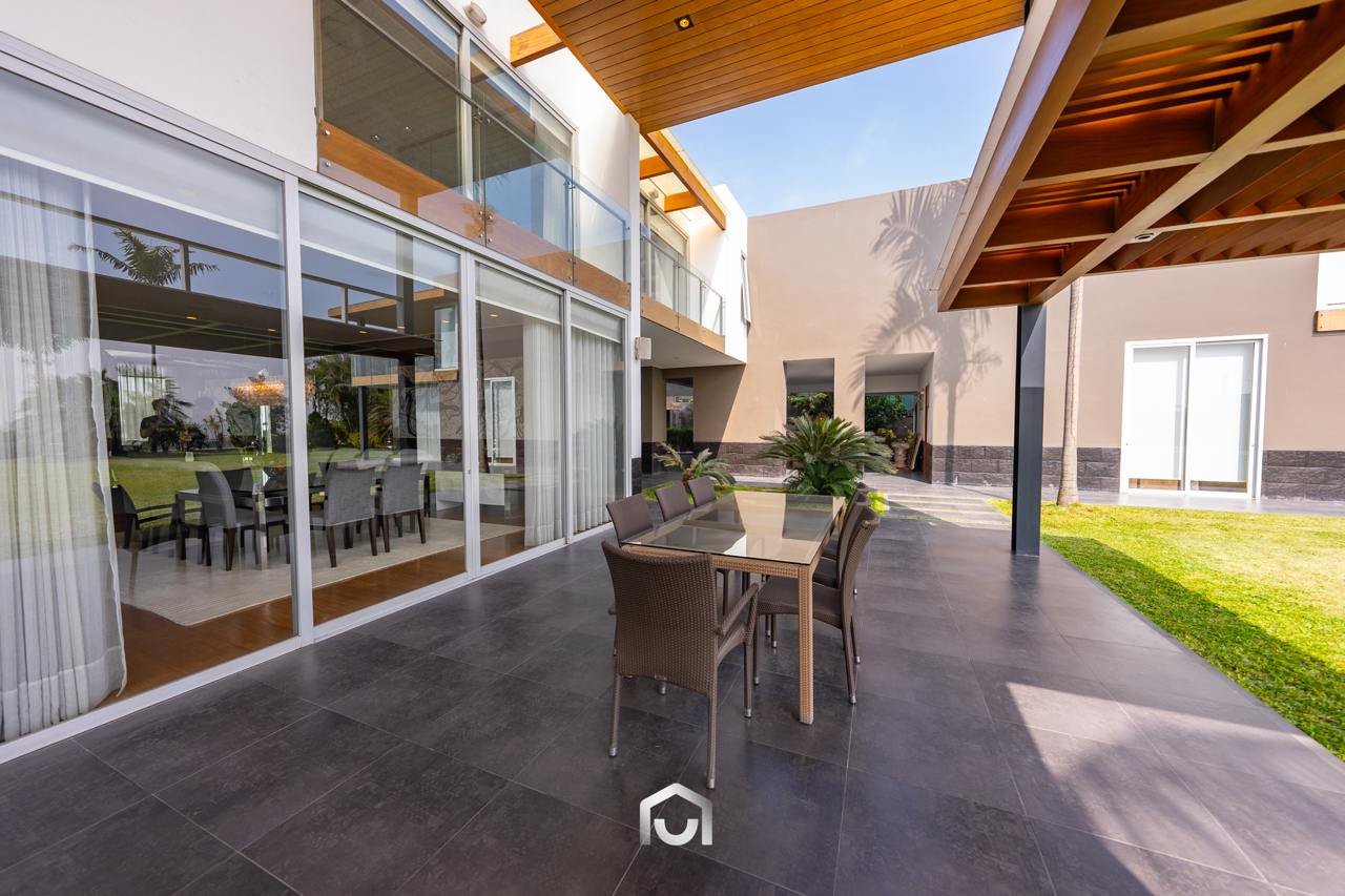 La casa ha sido construida completamente en un terreno nivelado, a pesar de que originalmente era inclinado. Presenta una fachada imponente con una puerta de gran tamaño. En el interior destacan los pisos claros y diversos elementos arquitectónicos diseñados por el arquitecto Mallachowski, como ductos de iluminación cenital que permiten una conexión visual constante con el jardín, la piscina y el cielo. La sala de doble altura se abre hacia una terraza con techos de madera, creando un ambiente cálido. La propiedad cuenta con acabados de alta calidad, una cava de vinos en el sótano ya equipada, y un jardín amplio. Además, incluye una piscina de buen tamaño y un ambiente adicional en el sótano con vista subacuática, ideal para gimnasio o sala de entretenimiento. En el segundo piso se ubican seis dormitorios con baño incorporado, siendo el principal una suite con ingreso privado, walk-in closet, baño con jacuzzi, espacio para masajeador y vistas al exterior gracias a ventanales en esquina.