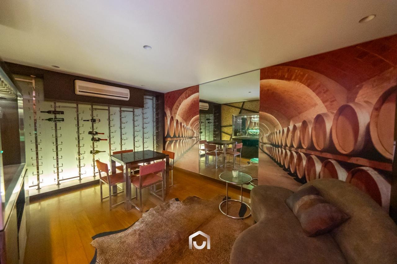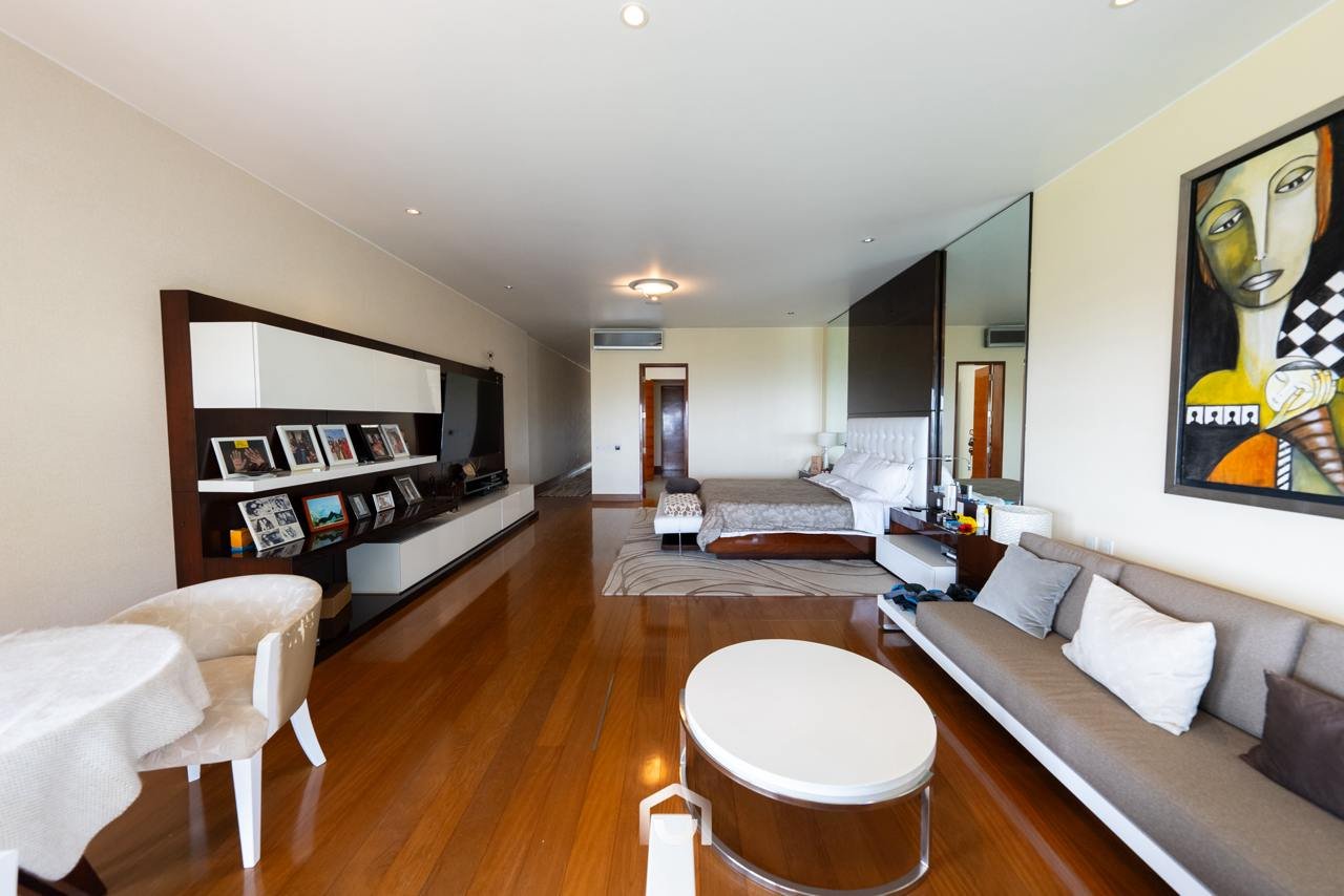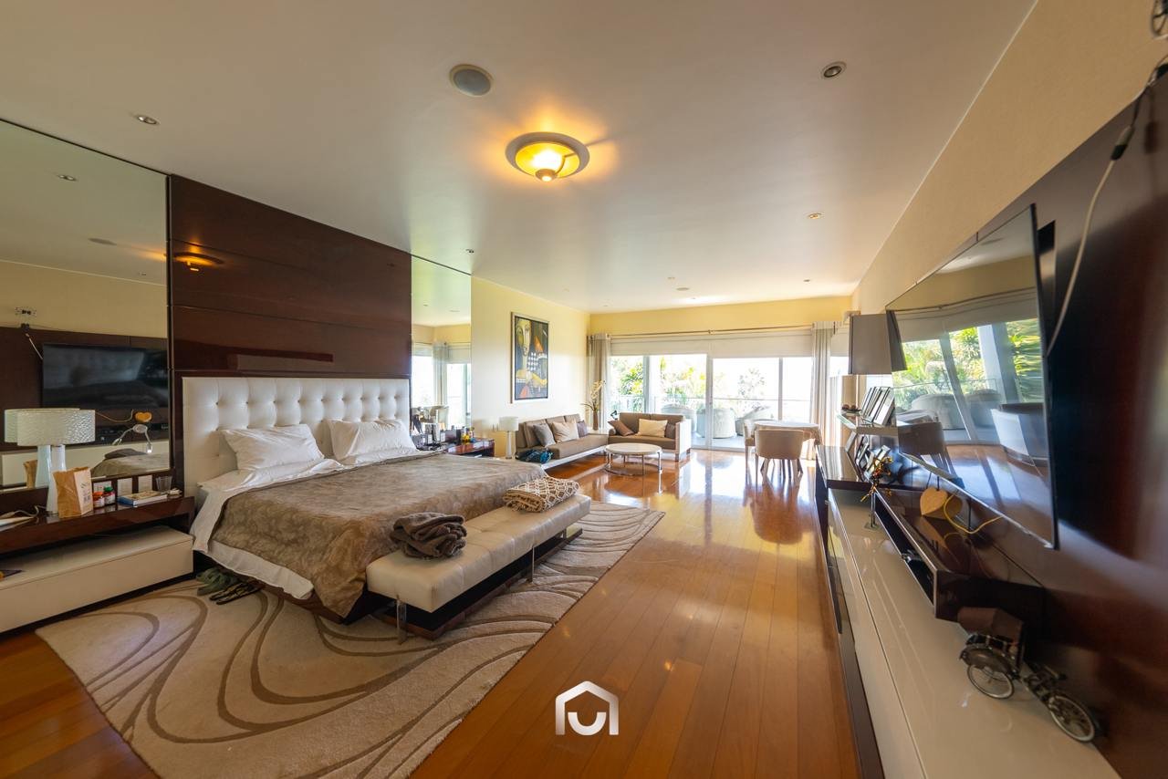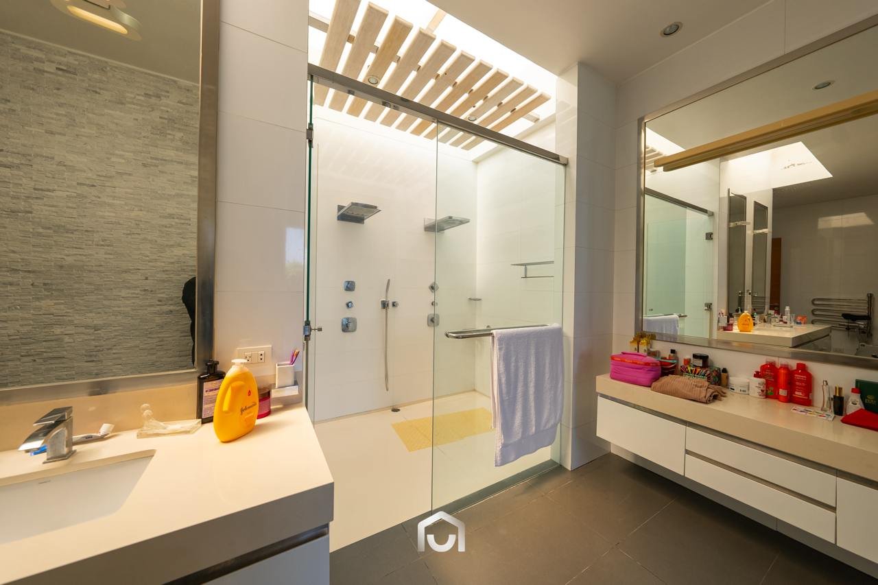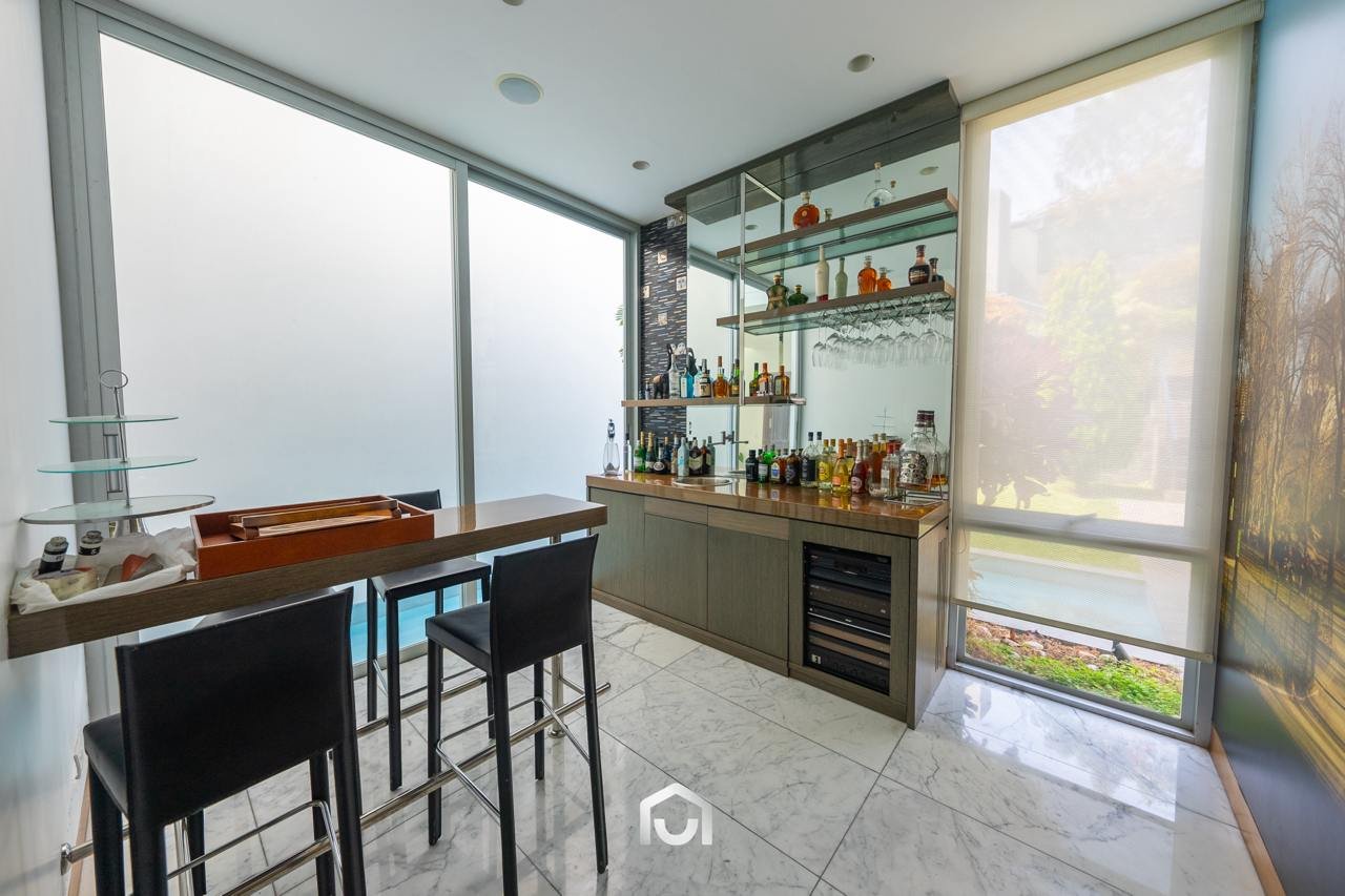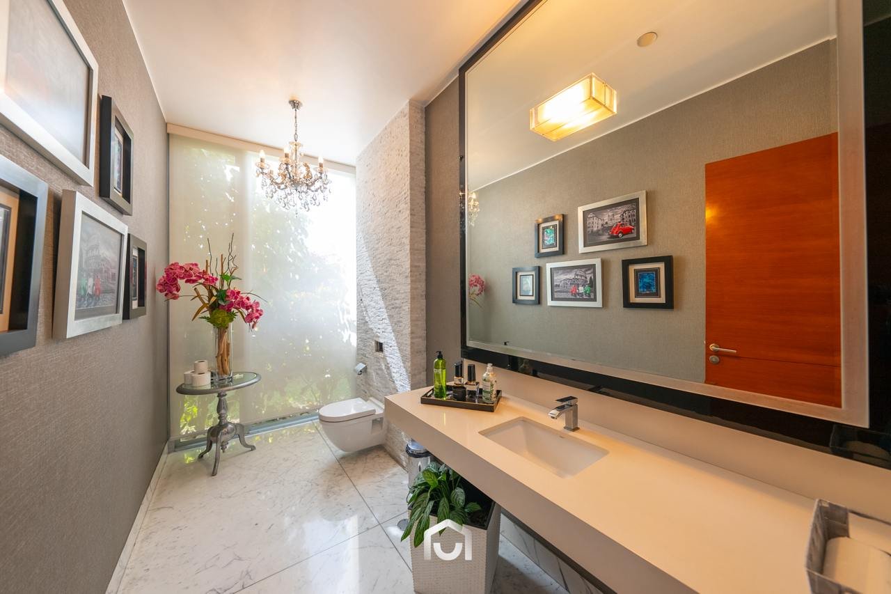 La casa ha sido construida completamente en un terreno nivelado, a pesar de que originalmente era inclinado. Presenta una fachada imponente con una puerta de gran tamaño. En el interior destacan los pisos claros y diversos elementos arquitectónicos diseñados por el arquitecto Mallachowski, como ductos de iluminación cenital que permiten una conexión visual constante con el jardín, la piscina y el cielo. La sala de doble altura se abre hacia una terraza con techos de madera, creando un ambiente cálido. La propiedad cuenta con acabados de alta calidad, una cava de vinos en el sótano ya equipada, y un jardín amplio. Además, incluye una piscina de buen tamaño y un ambiente adicional en el sótano con vista subacuática, ideal para gimnasio o sala de entretenimiento. En el segundo piso se ubican seis dormitorios con baño incorporado, siendo el principal una suite con ingreso privado, walk-in closet, baño con jacuzzi, espacio para masajeador y vistas al exterior gracias a ventanales en esquina.