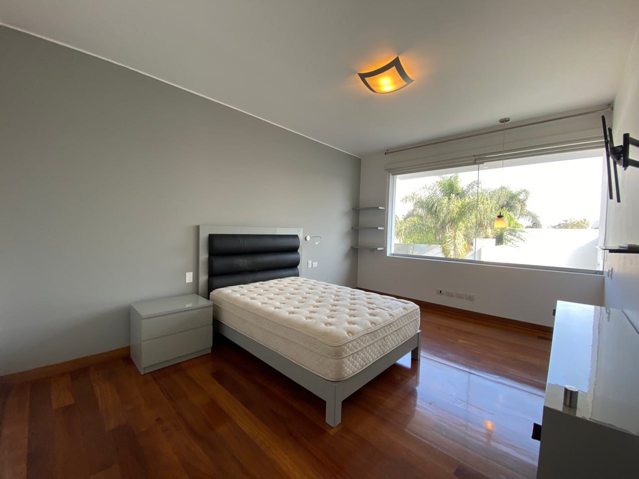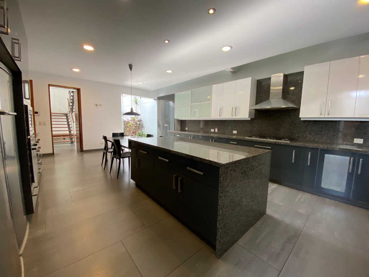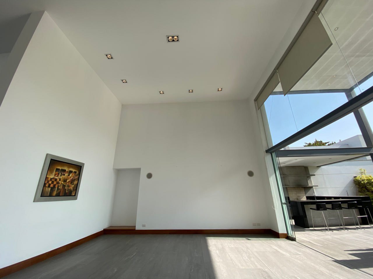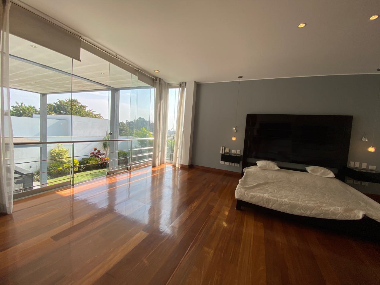 La propiedad cuenta con un área de terreno de 737 m² y un área construida de 658 m². Dispone de cuatro dormitorios, todos con baño incorporado, sumando un total de siete baños. El dormitorio principal incluye walk-in closet y jacuzzi. La distribución comprende hall de ingreso, sala con chimenea, comedor formal y comedor de diario, cocina abierta, lavandería, dos cuartos de servicio con baño y un sótano que integra un salón de billar, bar, depósito y un mini departamento con baño completo. Presenta techo de triple altura, aire acondicionado y sistema de música en el primer piso.