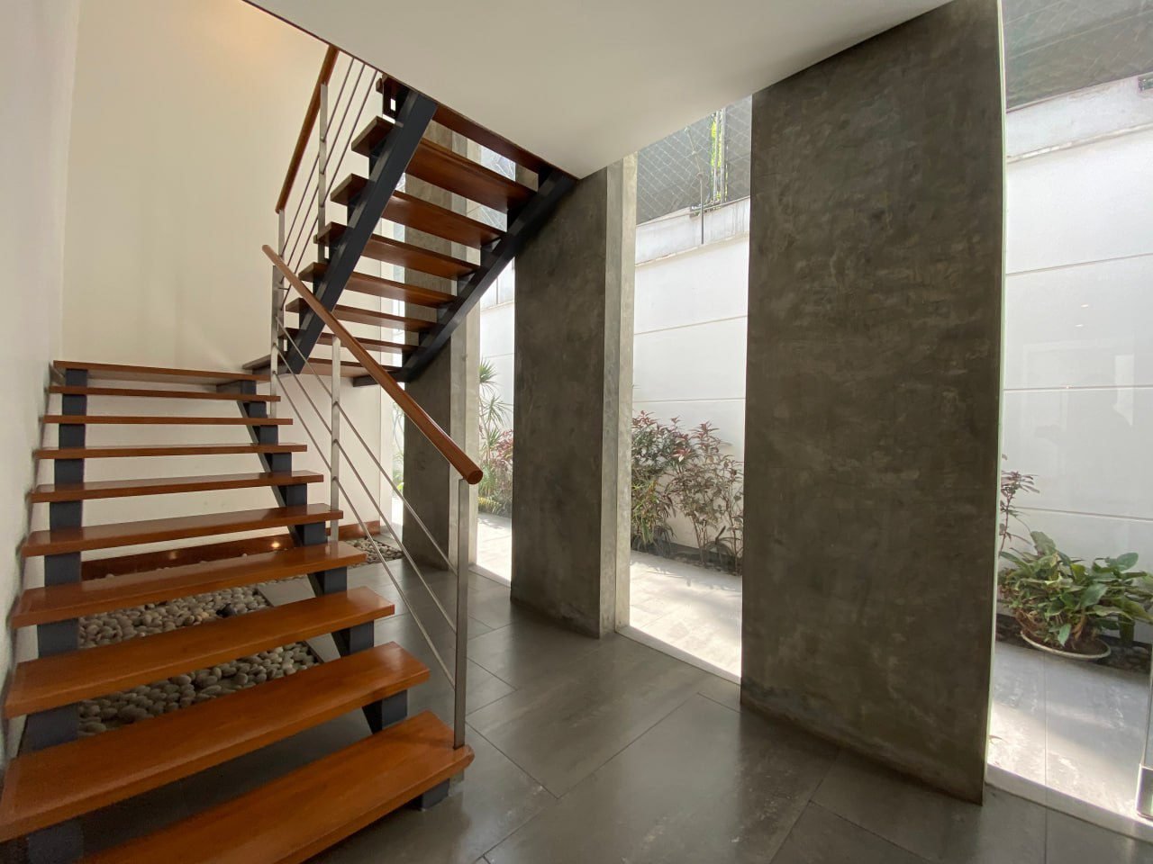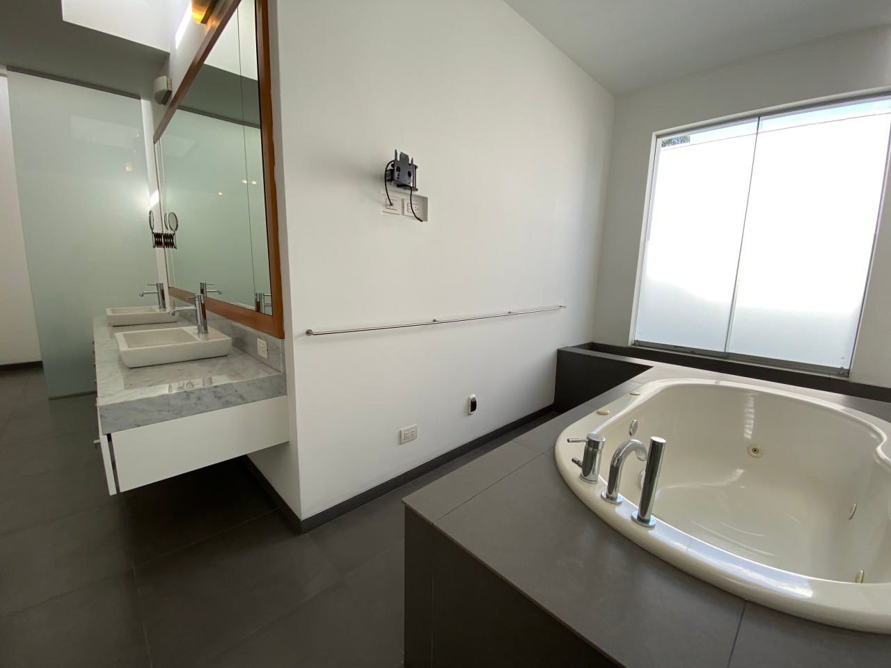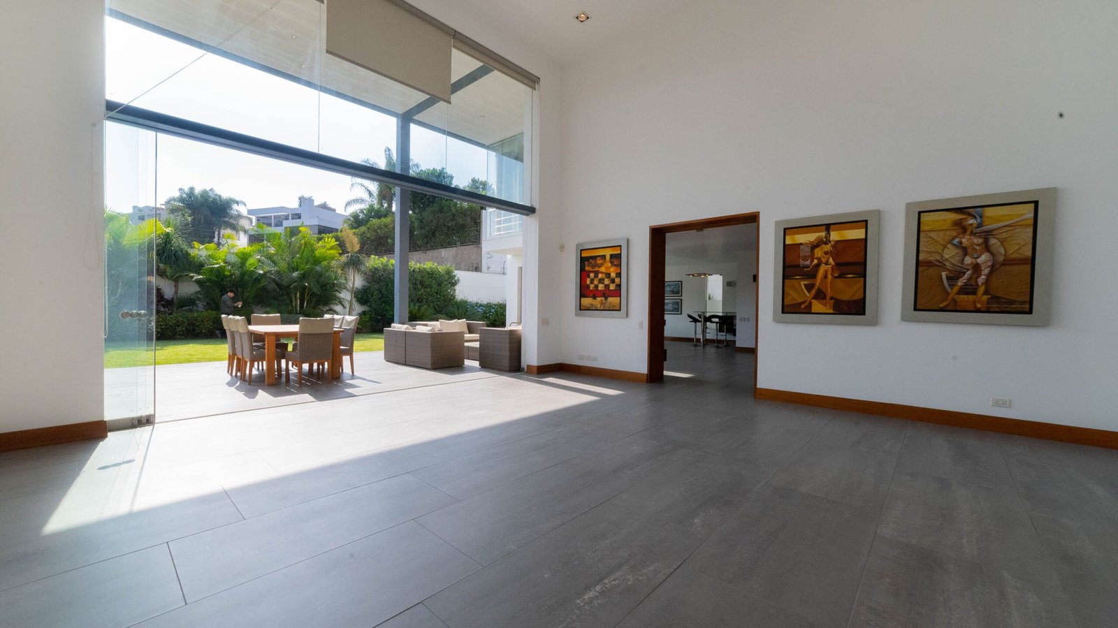 La propiedad cuenta con un área de terreno de 737 m² y un área construida de 658 m². Dispone de cuatro dormitorios, todos con baño incorporado, sumando un total de siete baños. El dormitorio principal incluye walk-in closet y jacuzzi. La distribución comprende hall de ingreso, sala con chimenea, comedor formal y comedor de diario, cocina abierta, lavandería, dos cuartos de servicio con baño y un sótano que integra un salón de billar, bar, depósito y un mini departamento con baño completo. Presenta techo de triple altura, aire acondicionado y sistema de música en el primer piso.