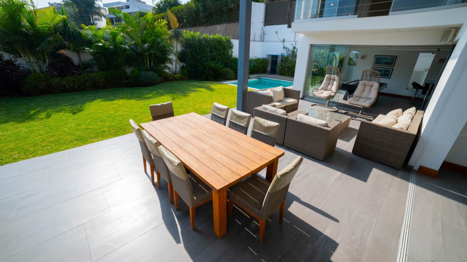 La casa ofrece jardín y piscina, además de un baño adicional para la zona de piscina. Cuenta con cuatro cocheras paralelas y techadas. El condominio dispone de guardianía, cerco eléctrico y sistema de cámaras de seguridad. Se permite la tenencia de mascotas.