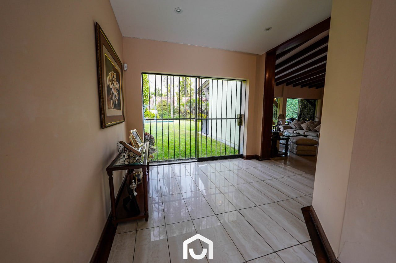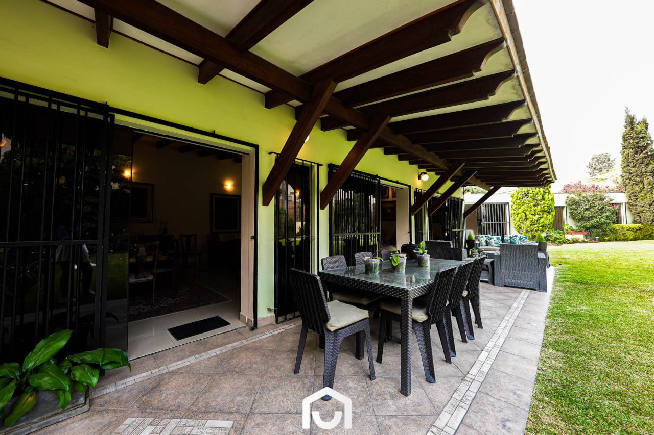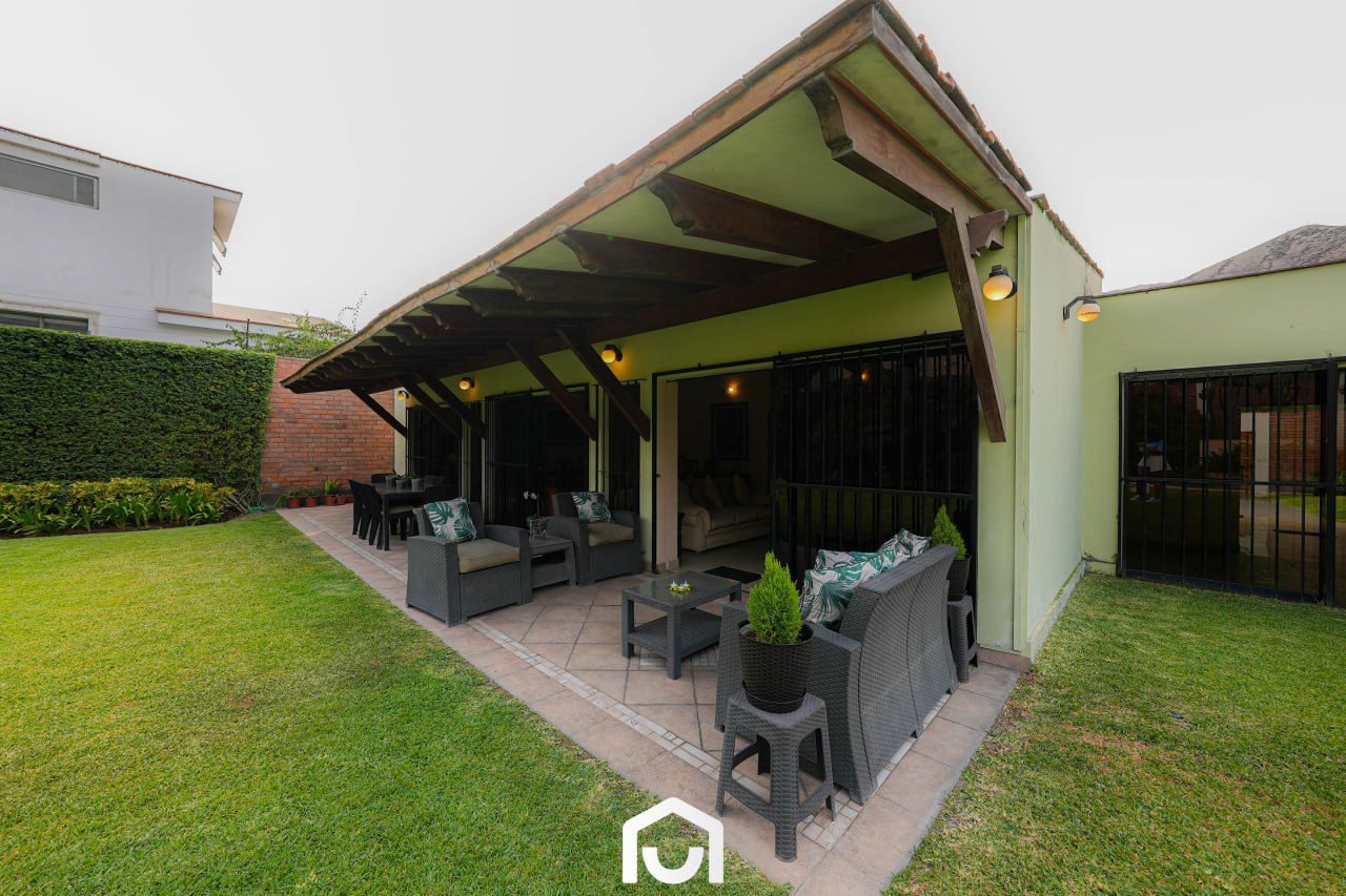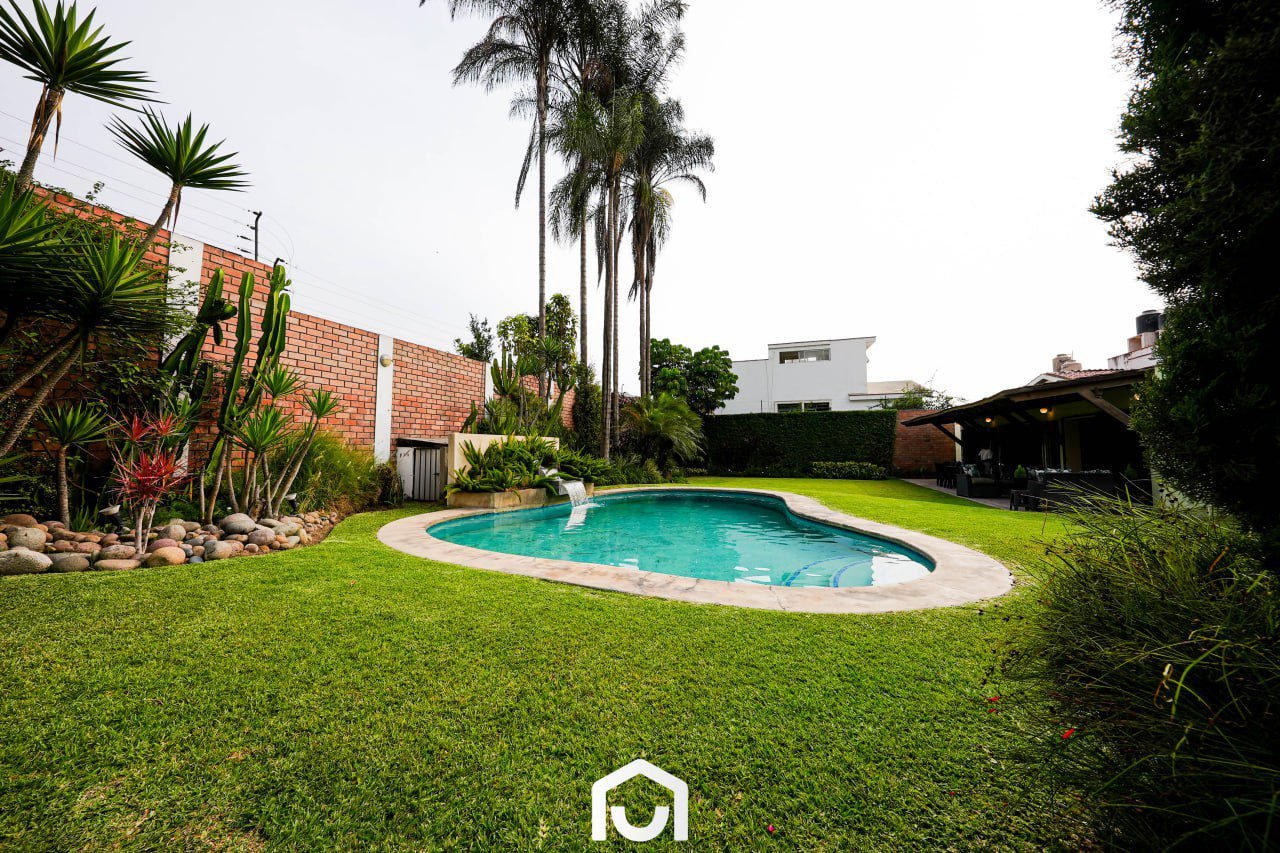 En el exterior se encuentran la terraza, piscina y un jardín amplio con sistema de riego automatizado por aspersión y goteo. Estos espacios complementan el área social de la vivienda y permiten su uso para actividades al aire libre.