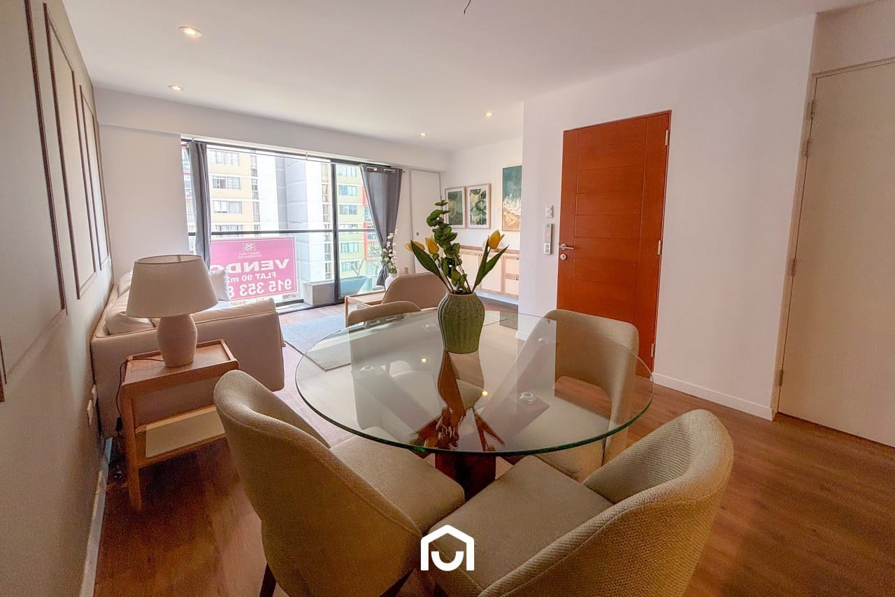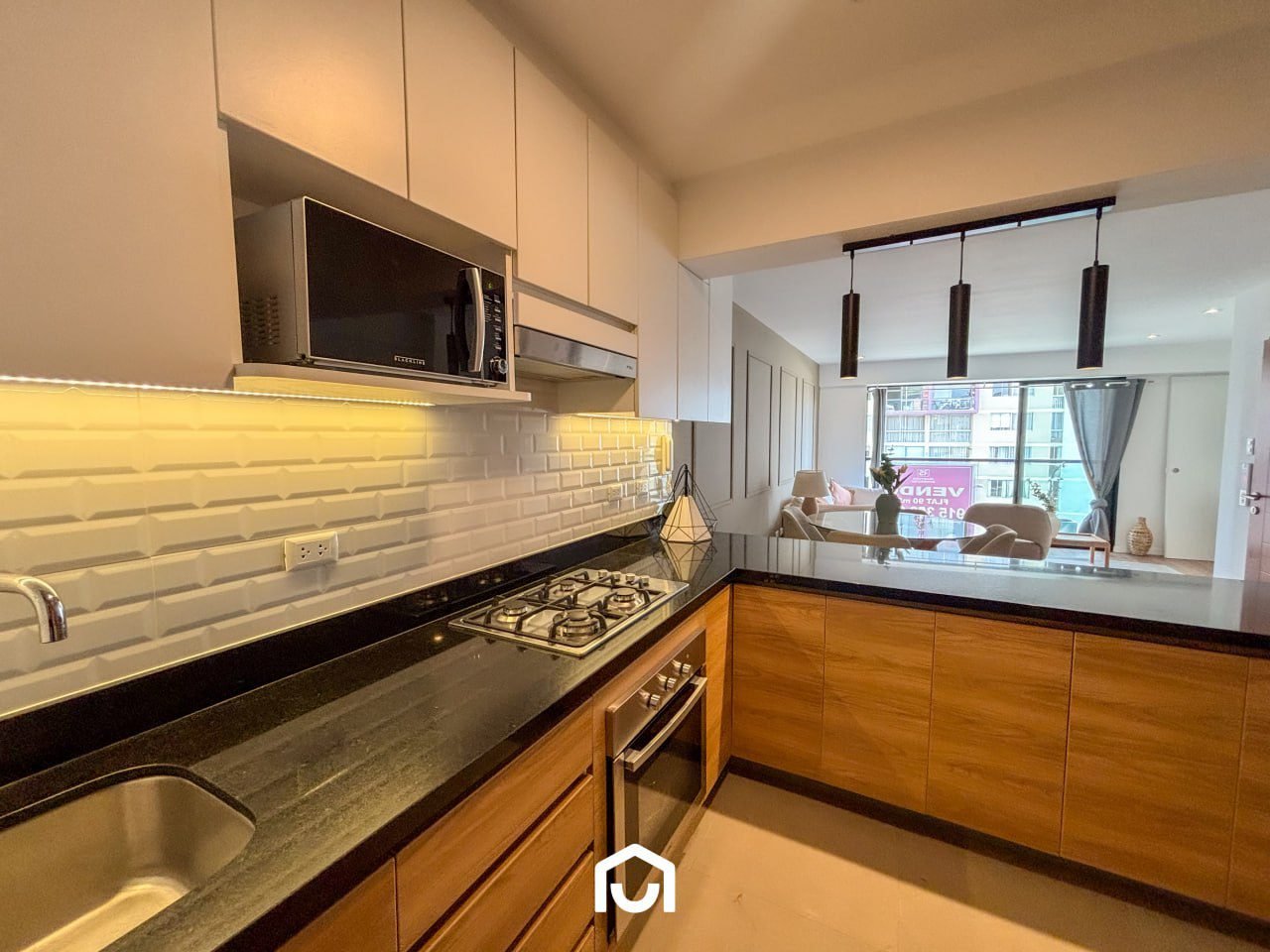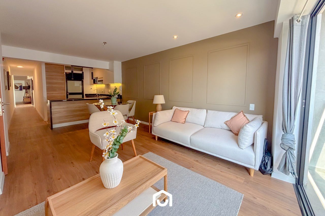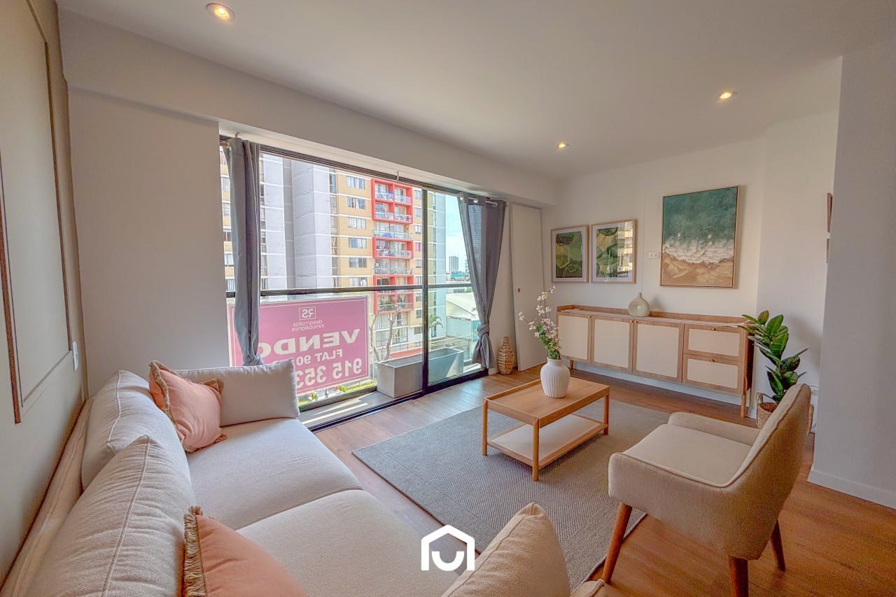 El inmueble es un departamento flat de estreno con vista exterior, que cuenta con un área techada y área ocupada de 91 m². La distribución incluye sala-comedor con balcón, cocina tipo americana equipada, tres dormitorios, una sala de estar, dos baños (el dormitorio principal con tina y el baño secundario con ducha) y lavandería discretamente integrada en un clóset. Los acabados son modernos y funcionales, y el edificio dispone de ascensor directo al departamento. Es una propiedad pet friendly y no está afecta al pago de alcabala. La entrega es inmediata.